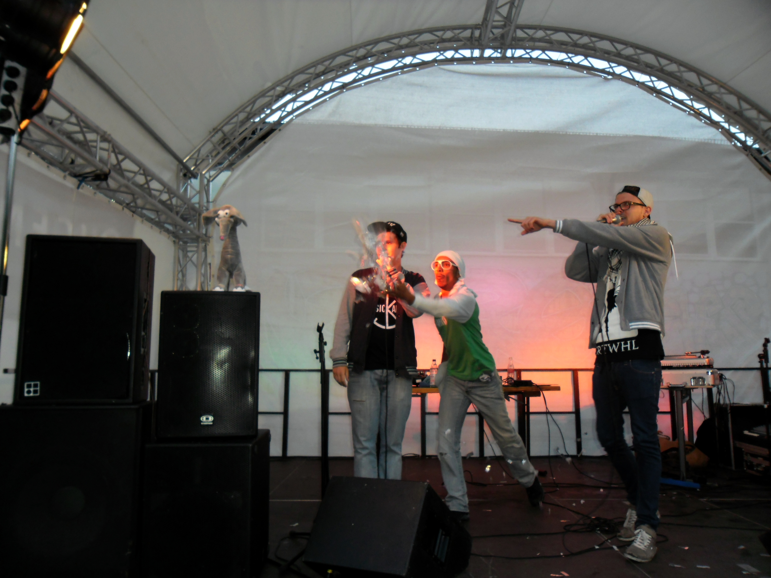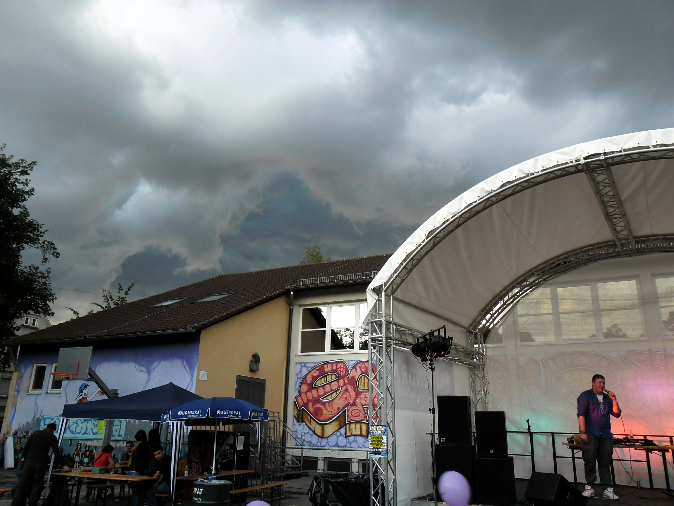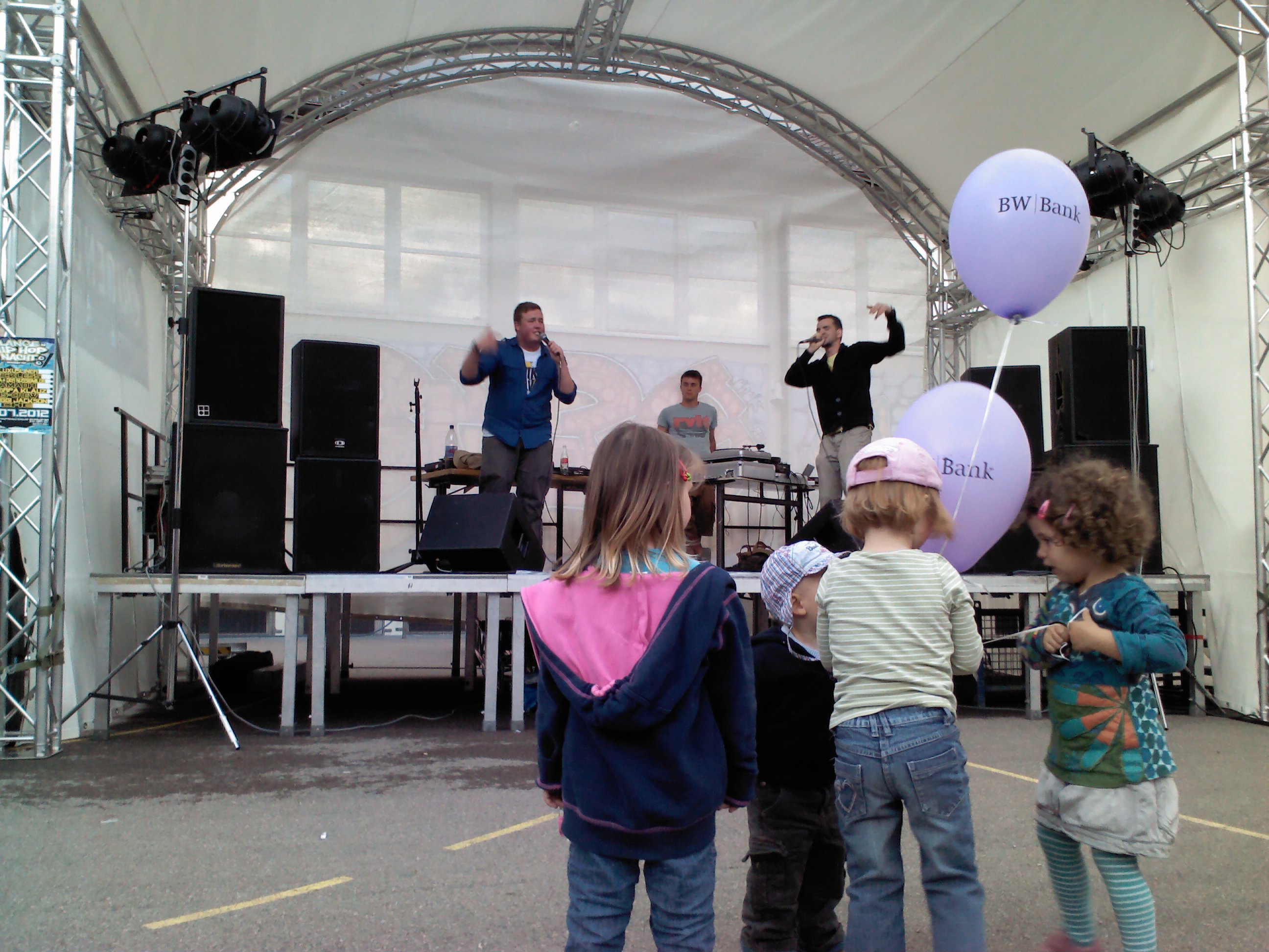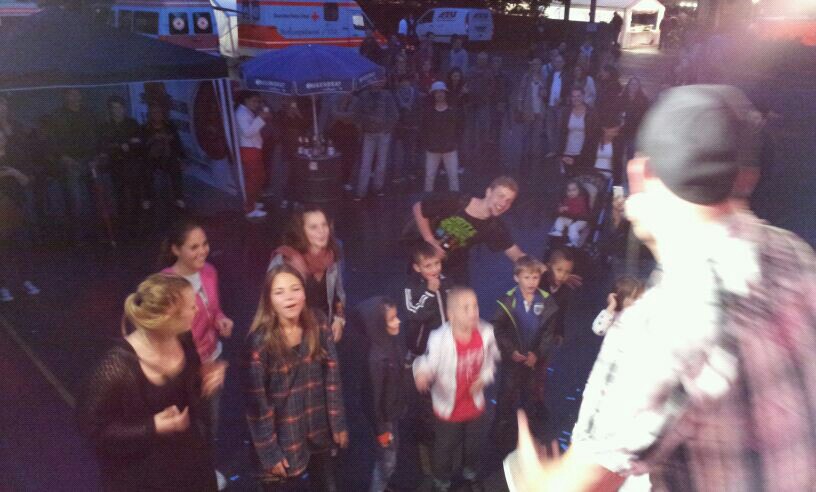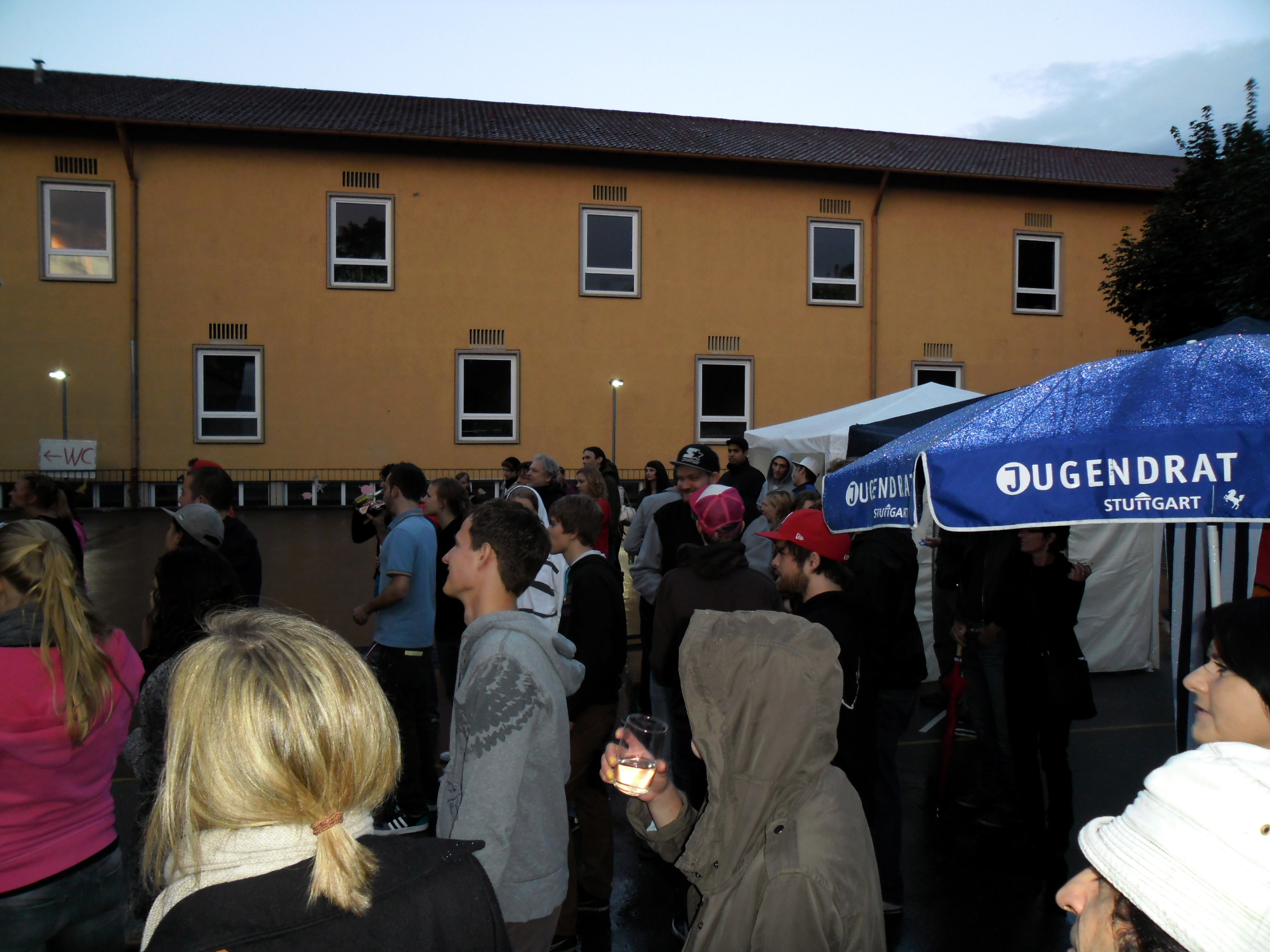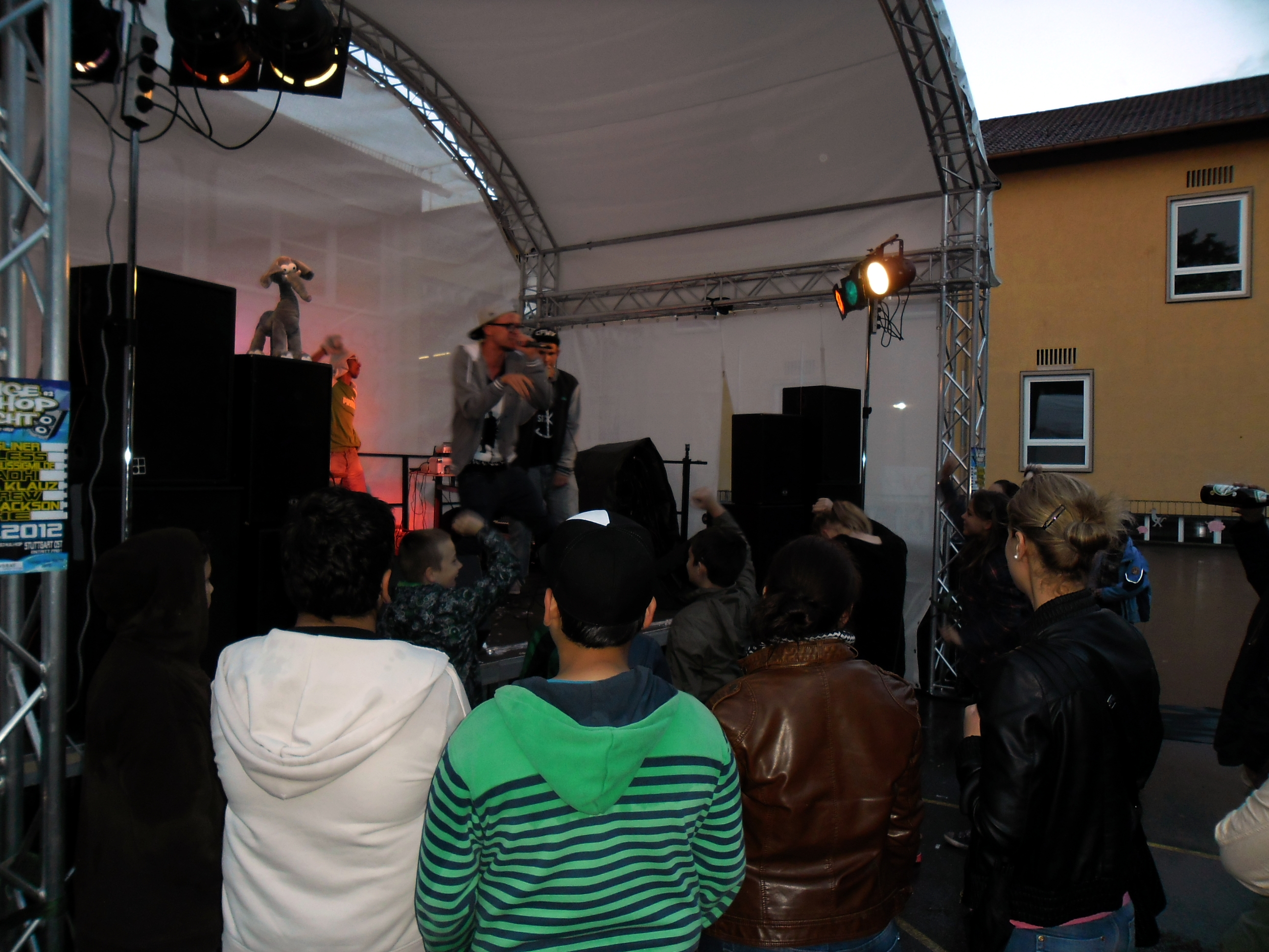 Und auch wenn sich das Publikum meistens reserviert zeigte, bemühte sich gerade einer dies zu ändern. Körpa Klauz riss auch ohne das richtige Passwort eine Show vom Stapel, die ihresgleichen suchte. Der große Hip-Hop-Kindergeburtstag war am Laufen und Klauz als der coole Clown mittendrin. Da ließen sich die ganz kleinen Zuschauer nicht lumpen und tanzten vor der Bühne, als wäre Barney der Dinosaurier zurück. Man kann nur gewinnen, wenn man einen Stuttgarter Babyboom berappt und anschließend den Aal-Tanz propagiert. Familienunterhaltung at the best. Zu späterer Stunde fanden sich immer mehr Menschen auf dem Hof der Gablenberger Hauptschule ein. Shema und der Nussigmilde gaben der Menge Rap. Und zwar ordentlich. So richtig mit Bumm und Tschak. Ein Gastspiel von Zwei mit Mike inklusive. Sickless und Jay von wirscheissengold betraten ebenfalls die Bühne, um der Hörerschaft ihre Idee von Rap zu präsentieren. Da kam auch ein Abstecher in immer beliebter werdende Dubstep-Gefilde nicht zu kurz.