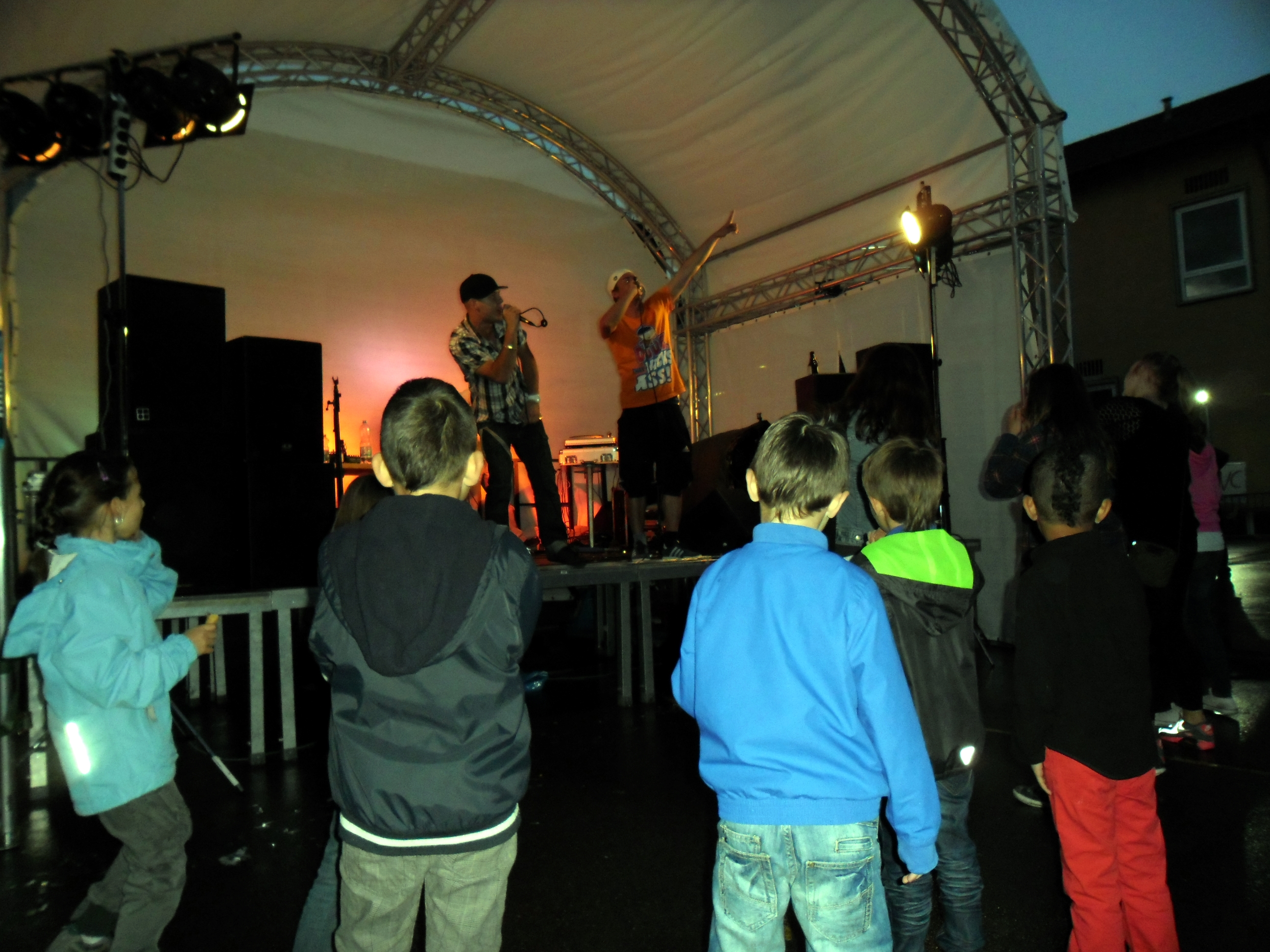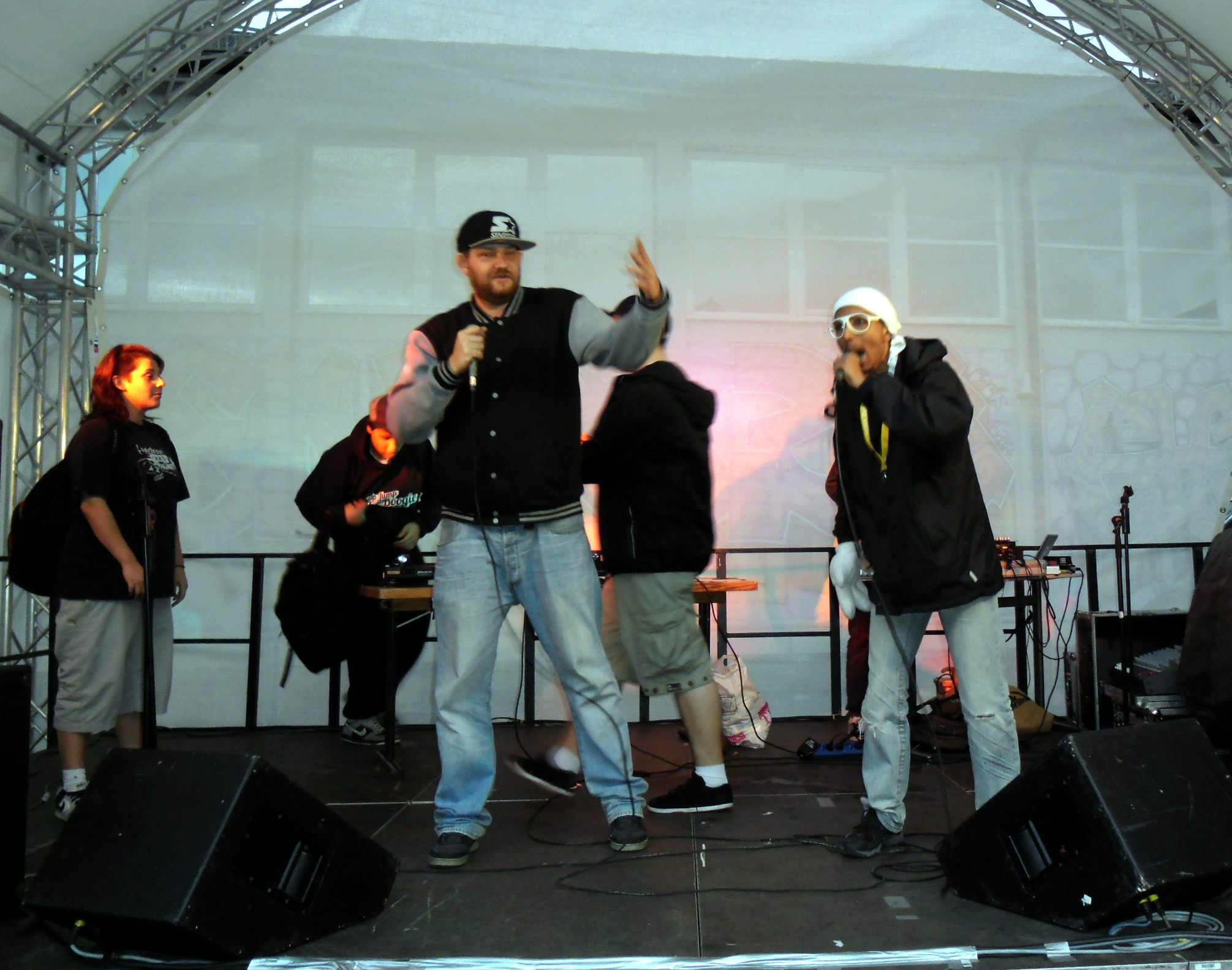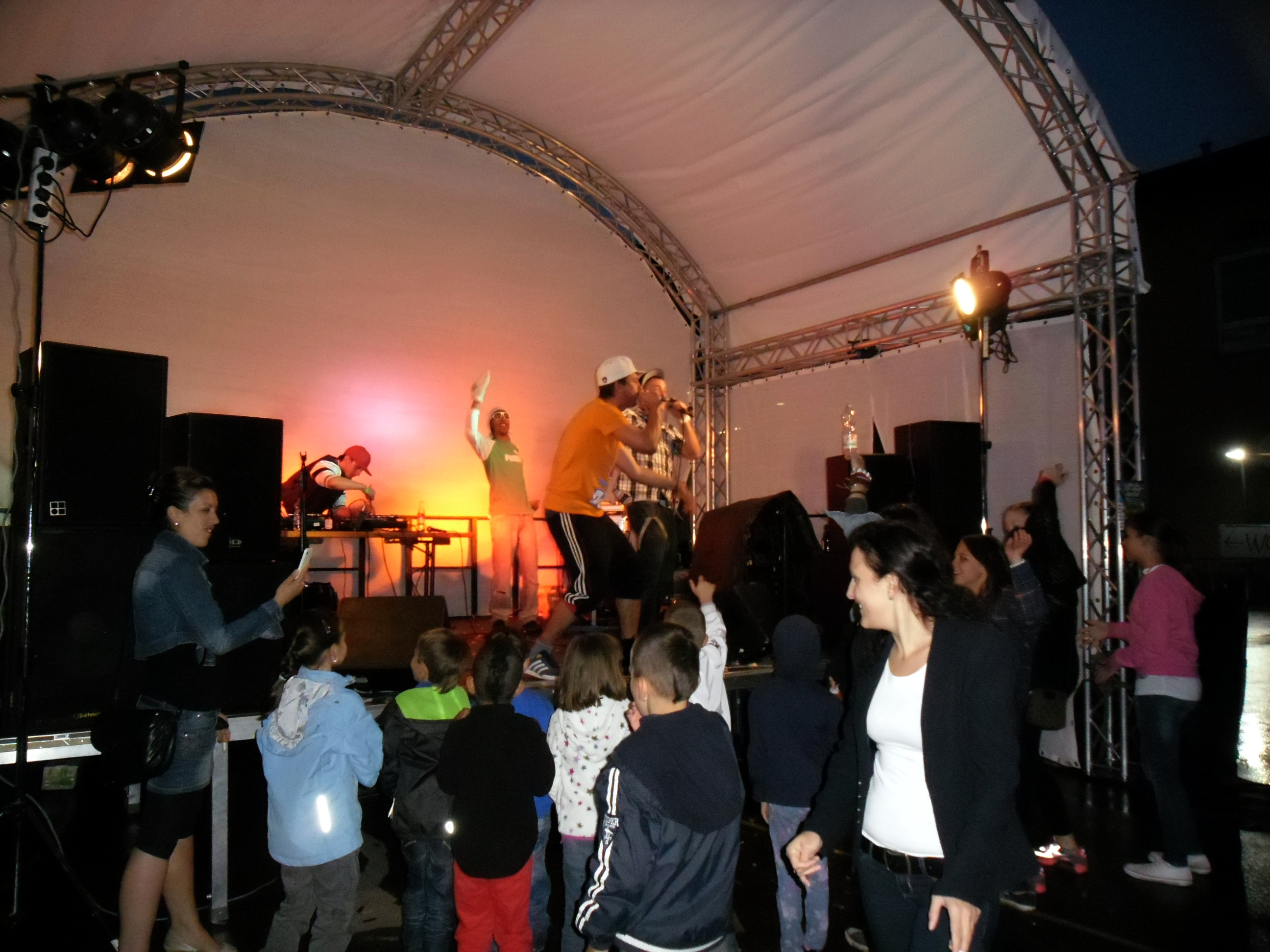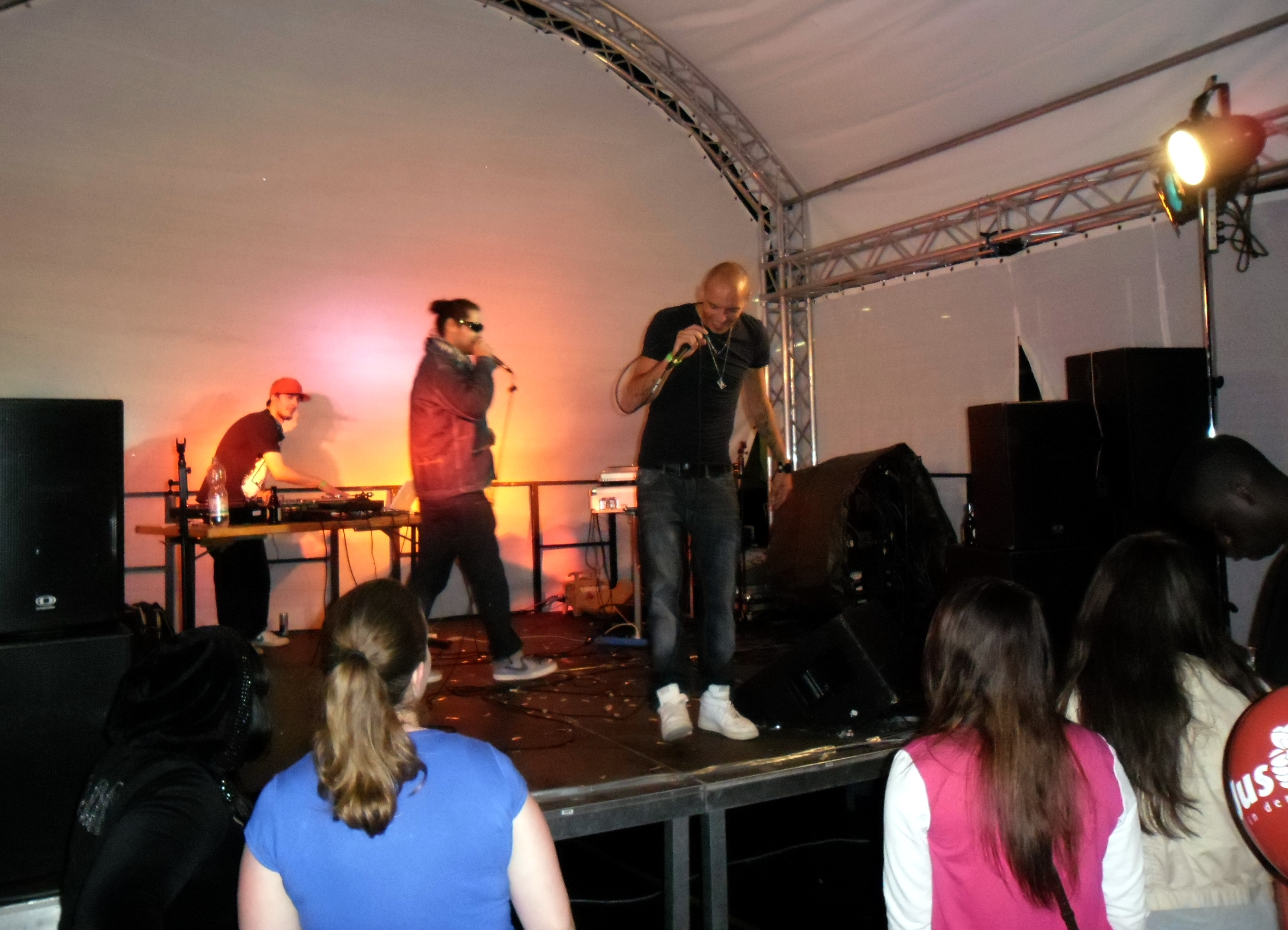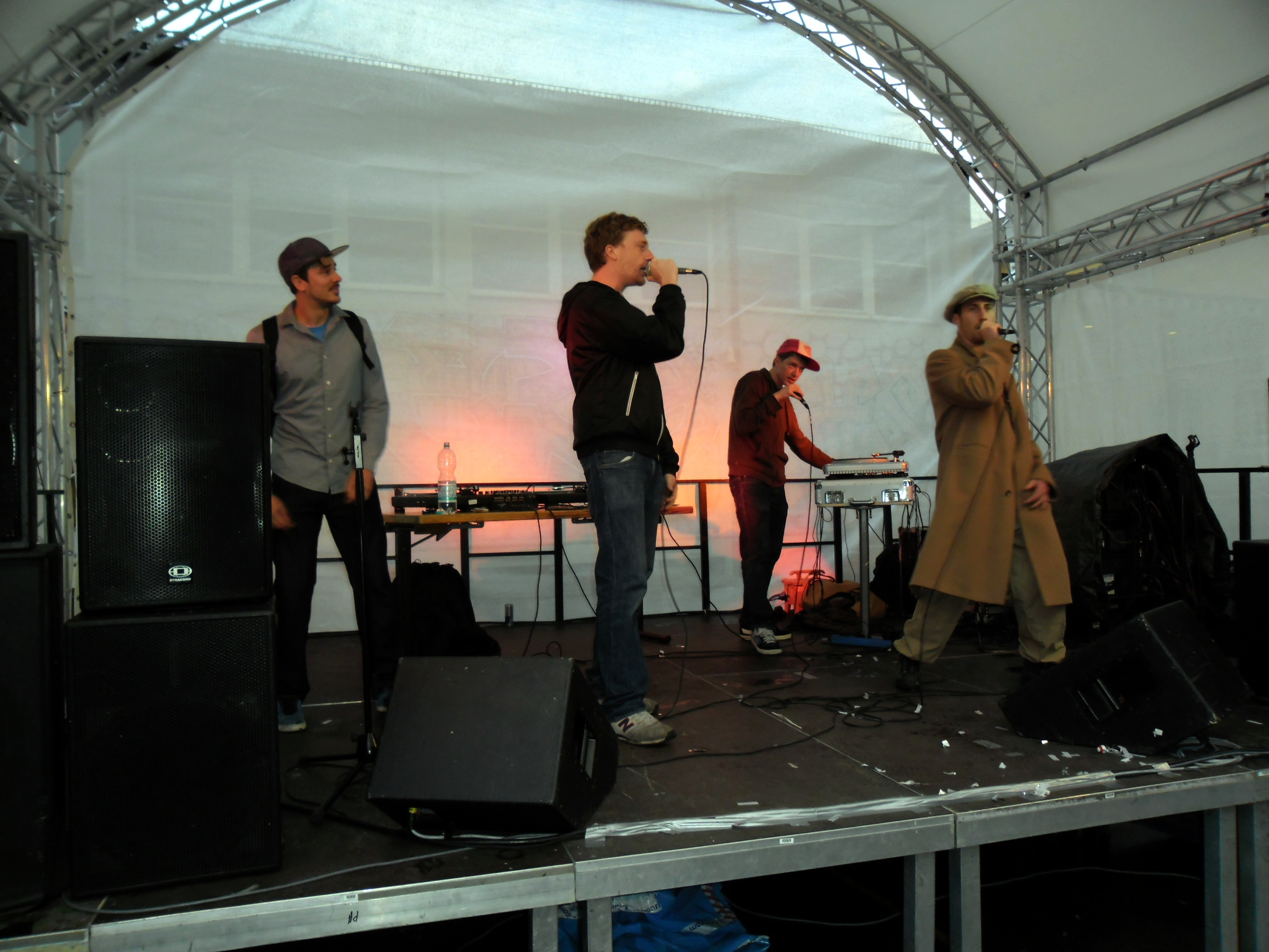 Und auch wenn sich das Publikum meistens reserviert zeigte, bemühte sich gerade einer dies zu ändern. Körpa Klauz riss auch ohne das richtige Passwort eine Show vom Stapel, die ihresgleichen suchte. Der große Hip-Hop-Kindergeburtstag war am Laufen und Klauz als der coole Clown mittendrin. Da ließen sich die ganz kleinen Zuschauer nicht lumpen und tanzten vor der Bühne, als wäre Barney der Dinosaurier zurück. Man kann nur gewinnen, wenn man einen Stuttgarter Babyboom berappt und anschließend den Aal-Tanz propagiert. Familienunterhaltung at the best. Zu späterer Stunde fanden sich immer mehr Menschen auf dem Hof der Gablenberger Hauptschule ein. Shema und der Nussigmilde gaben der Menge Rap. Und zwar ordentlich. So richtig mit Bumm und Tschak. Ein Gastspiel von Zwei mit Mike inklusive. Sickless und Jay von wirscheissengold betraten ebenfalls die Bühne, um der Hörerschaft ihre Idee von Rap zu präsentieren. Da kam auch ein Abstecher in immer beliebter werdende Dubstep-Gefilde nicht zu kurz.