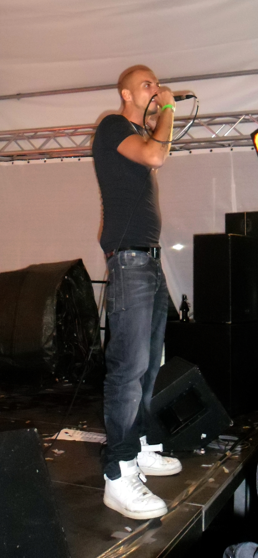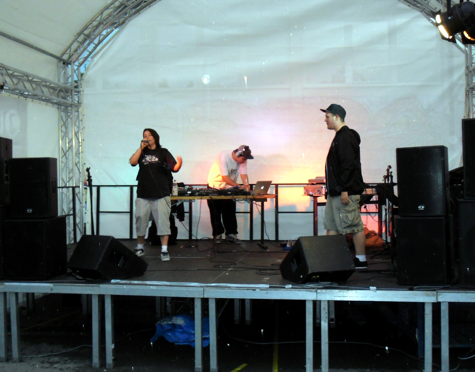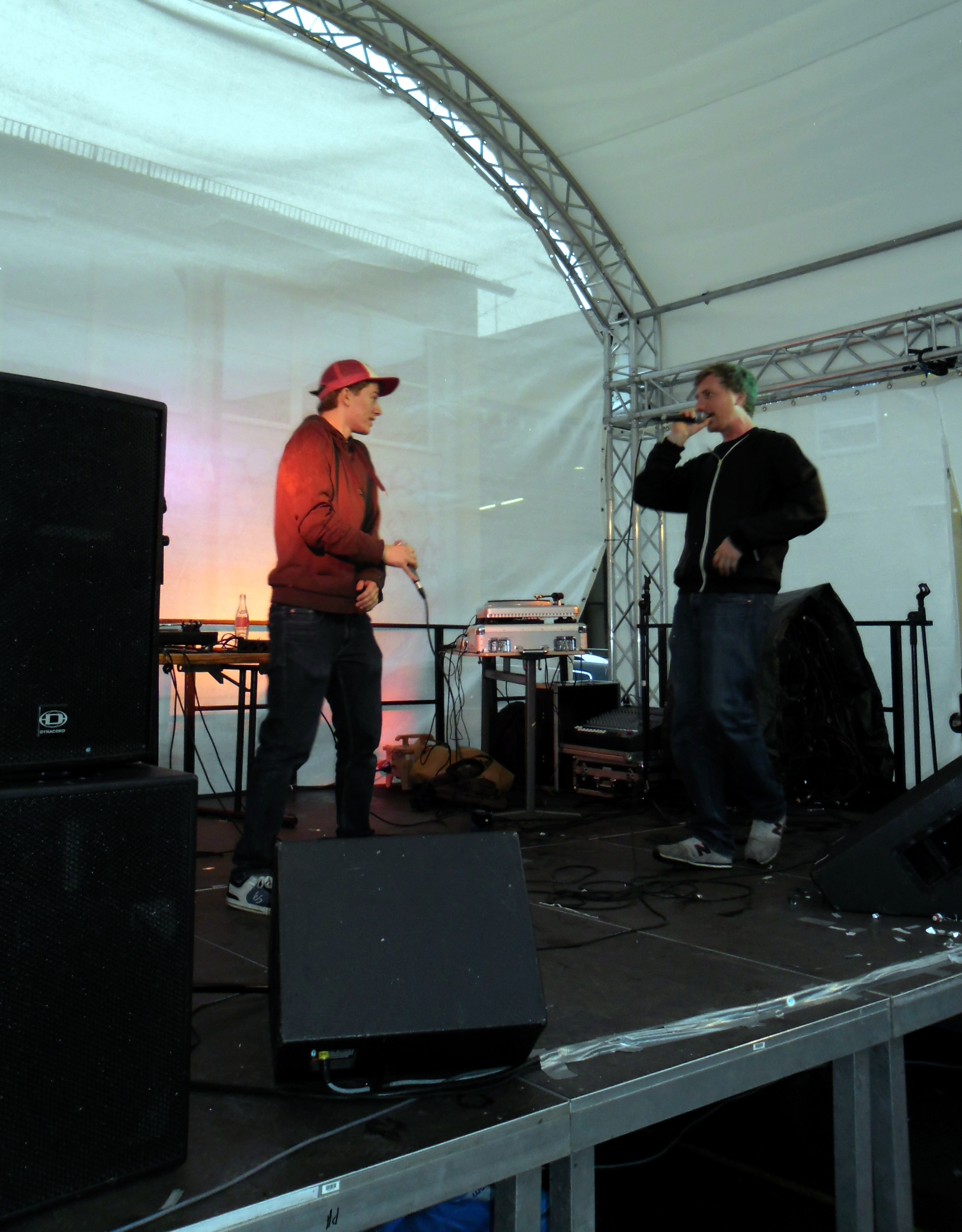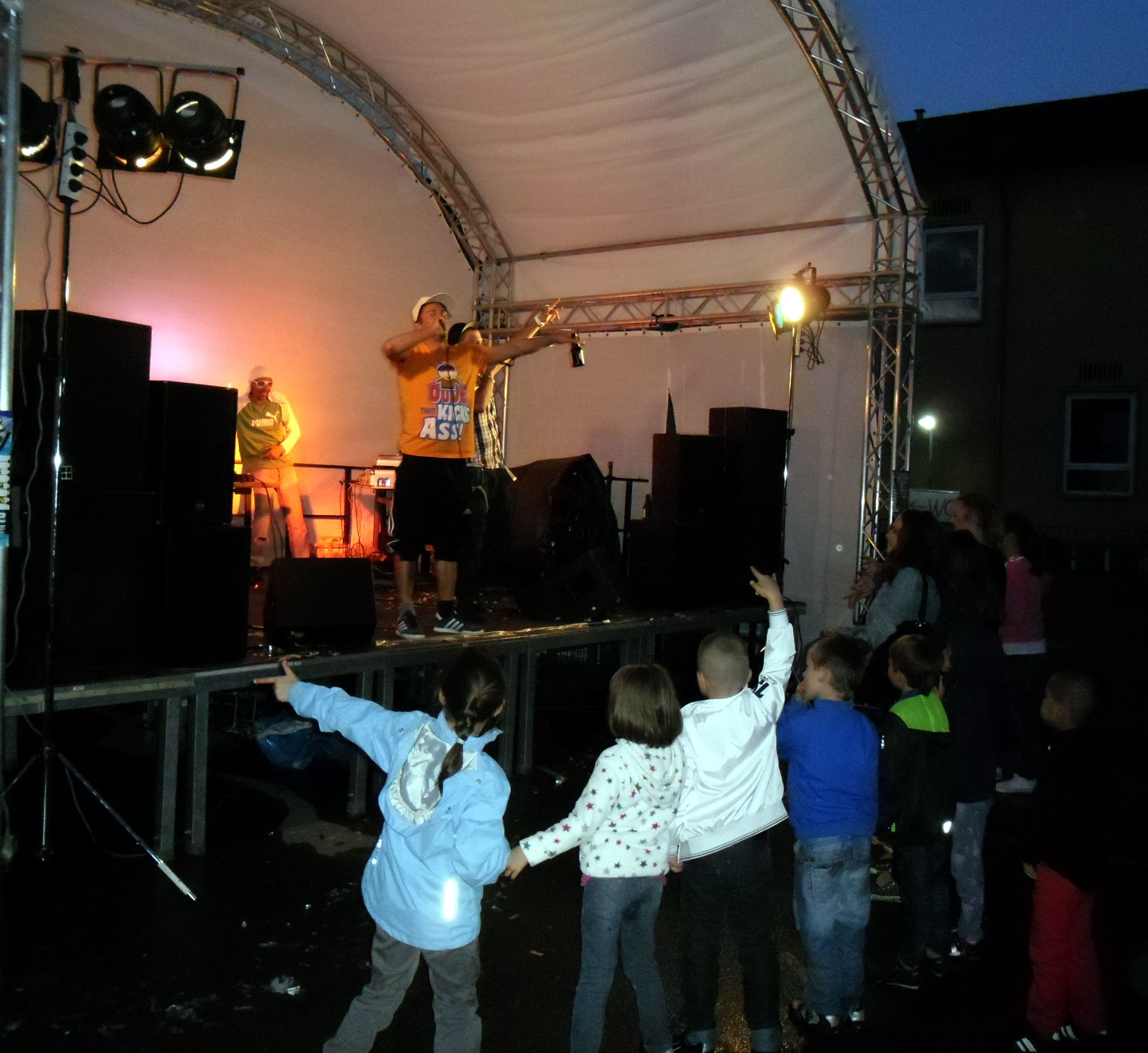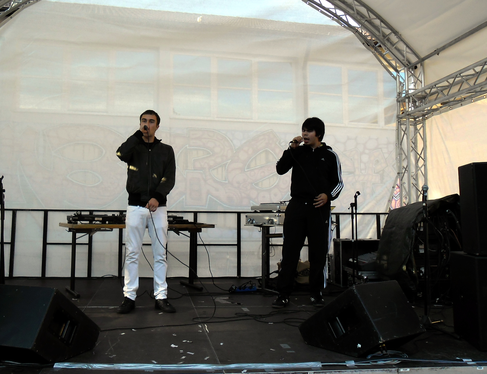 Und auch wenn sich das Publikum meistens reserviert zeigte, bemühte sich gerade einer dies zu ändern. Körpa Klauz riss auch ohne das richtige Passwort eine Show vom Stapel, die ihresgleichen suchte. Der große Hip-Hop-Kindergeburtstag war am Laufen und Klauz als der coole Clown mittendrin. Da ließen sich die ganz kleinen Zuschauer nicht lumpen und tanzten vor der Bühne, als wäre Barney der Dinosaurier zurück. Man kann nur gewinnen, wenn man einen Stuttgarter Babyboom berappt und anschließend den Aal-Tanz propagiert. Familienunterhaltung at the best. Zu späterer Stunde fanden sich immer mehr Menschen auf dem Hof der Gablenberger Hauptschule ein. Shema und der Nussigmilde gaben der Menge Rap. Und zwar ordentlich. So richtig mit Bumm und Tschak. Ein Gastspiel von Zwei mit Mike inklusive. Sickless und Jay von wirscheissengold betraten ebenfalls die Bühne, um der Hörerschaft ihre Idee von Rap zu präsentieren. Da kam auch ein Abstecher in immer beliebter werdende Dubstep-Gefilde nicht zu kurz.
