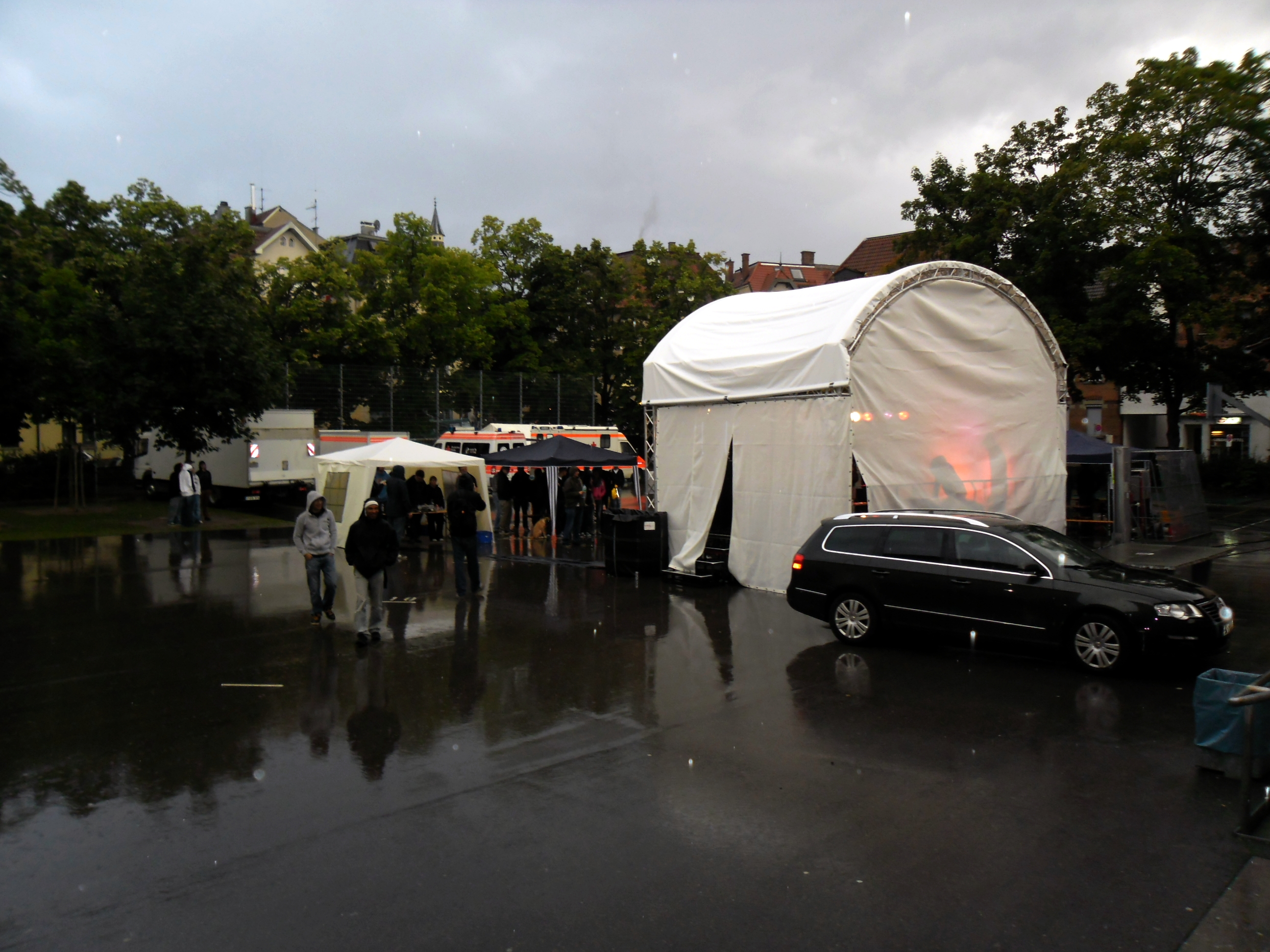 Ganz so gut blieb das Wetter im Laufe des Abends zwar nicht, doch mit Regenschirm und einer ordentlichen Portion Festival-Attitüde ließen sich Publikum und Künstler die Ost Nacht nicht kaputt machen. Che, der vor ein paar Wochen noch beim Stuttgarter Song-Slam im Renitenztheater überzeugte und bei der der Hip Hop Nacht unter anderem auf die Titelmelodie von „GTA: San Andreas“ rappte, und Biggie Jackson, der mit seinem halben Freundeskreis auf der Bühne stand, blieben noch vom Regen verschont. Suza und die NMS-Crew traf es dafür umso härter. „Gott pisst auf uns“, schreit sie ins Mikrofon und lässt sich von ihren Anhängern feiern. Unter dem Motto „Fick die Fotze, wir machen Penis-Rap“ sprechgesangte sich Suza mit ihren Jungs durch einen halbstündigen Auftritt, der zeigte, dass Suza in der baden-württembergischen Landeshauptstadt gemocht wird.