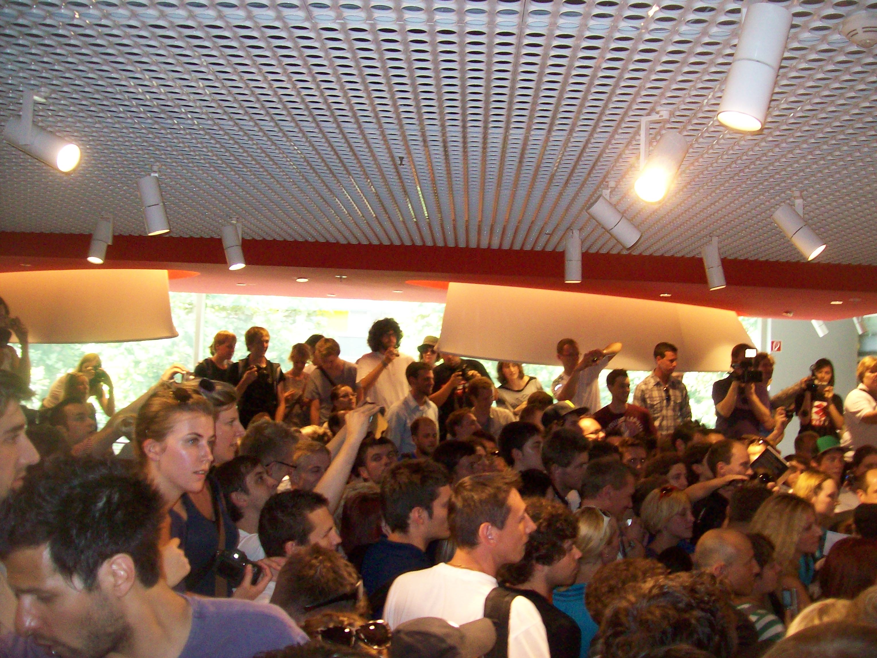 16.10 Uhr: Der Spaß kann beginnen! The Hoff betritt, begleitet von fünf Security-Männern, das Gebäude. Er lässt sich feiern, läuft ein wie ein Wrestling-Star. Auf der Bühne angekommen stimmt er seinen Schlüpferstürmer „Looking For Freedom“ an. Alle grölen. Dafür sind wir gekommen. David Hasselhoff als normalen Menschen will ungefähr niemand sehen.