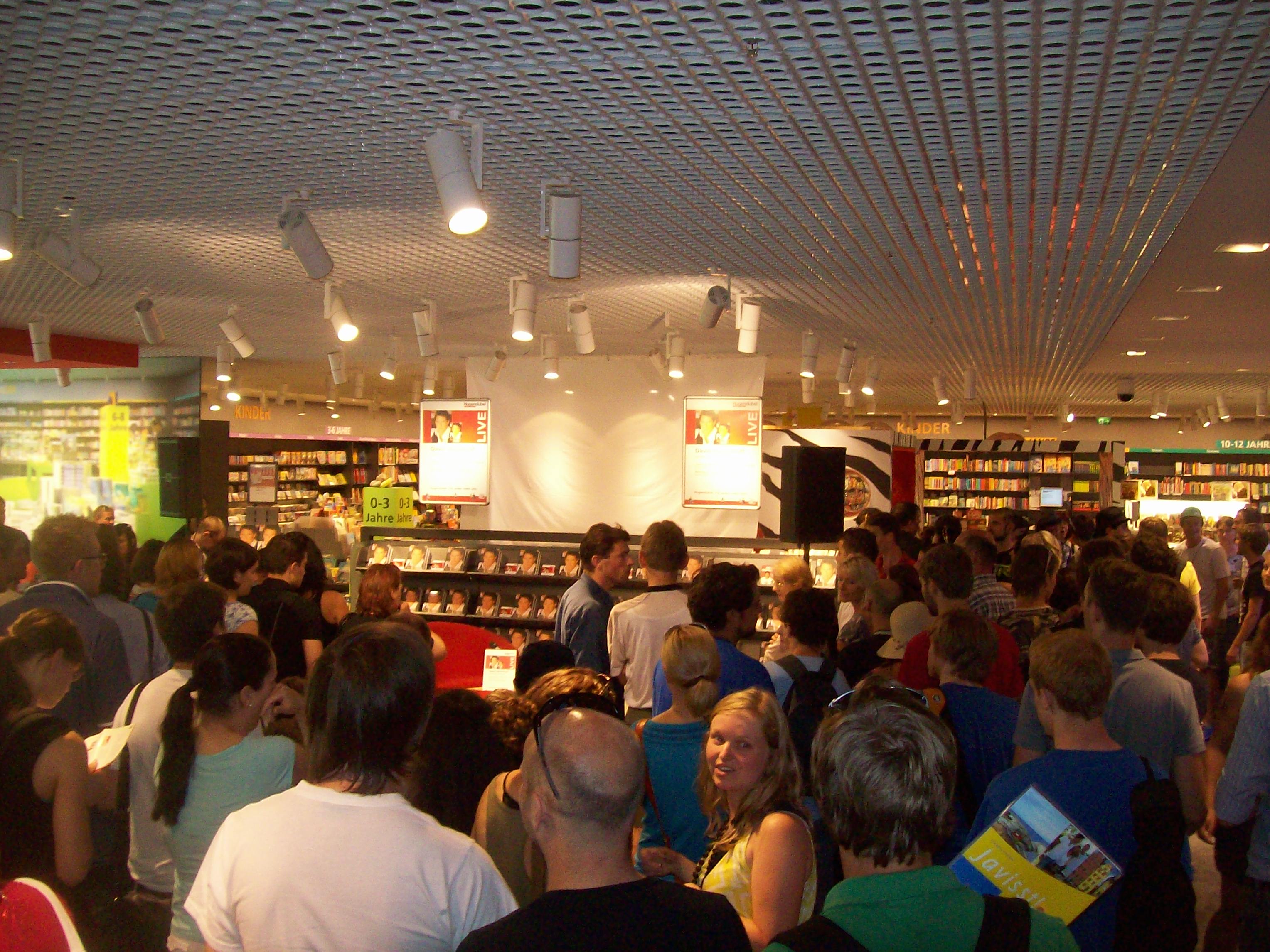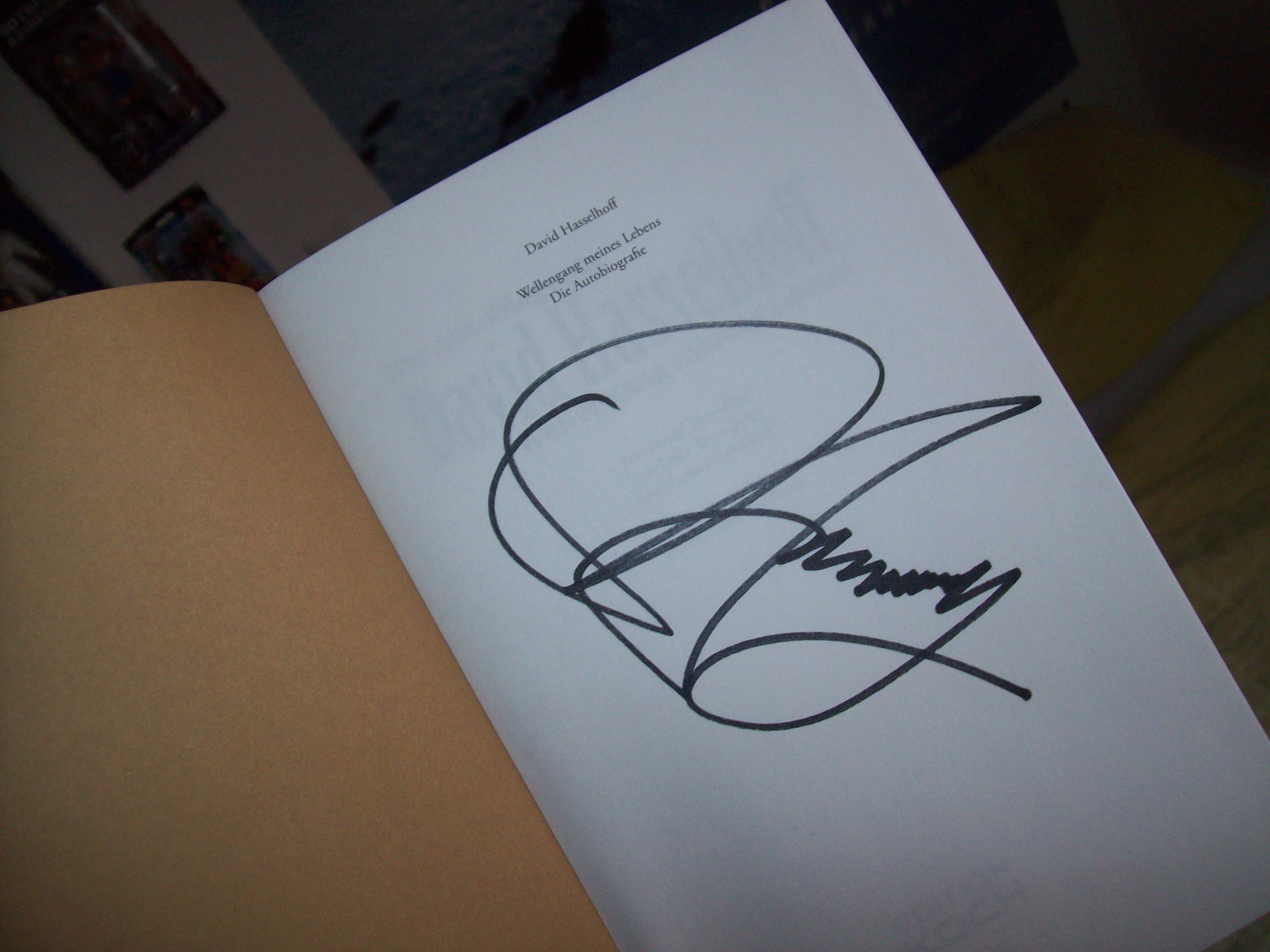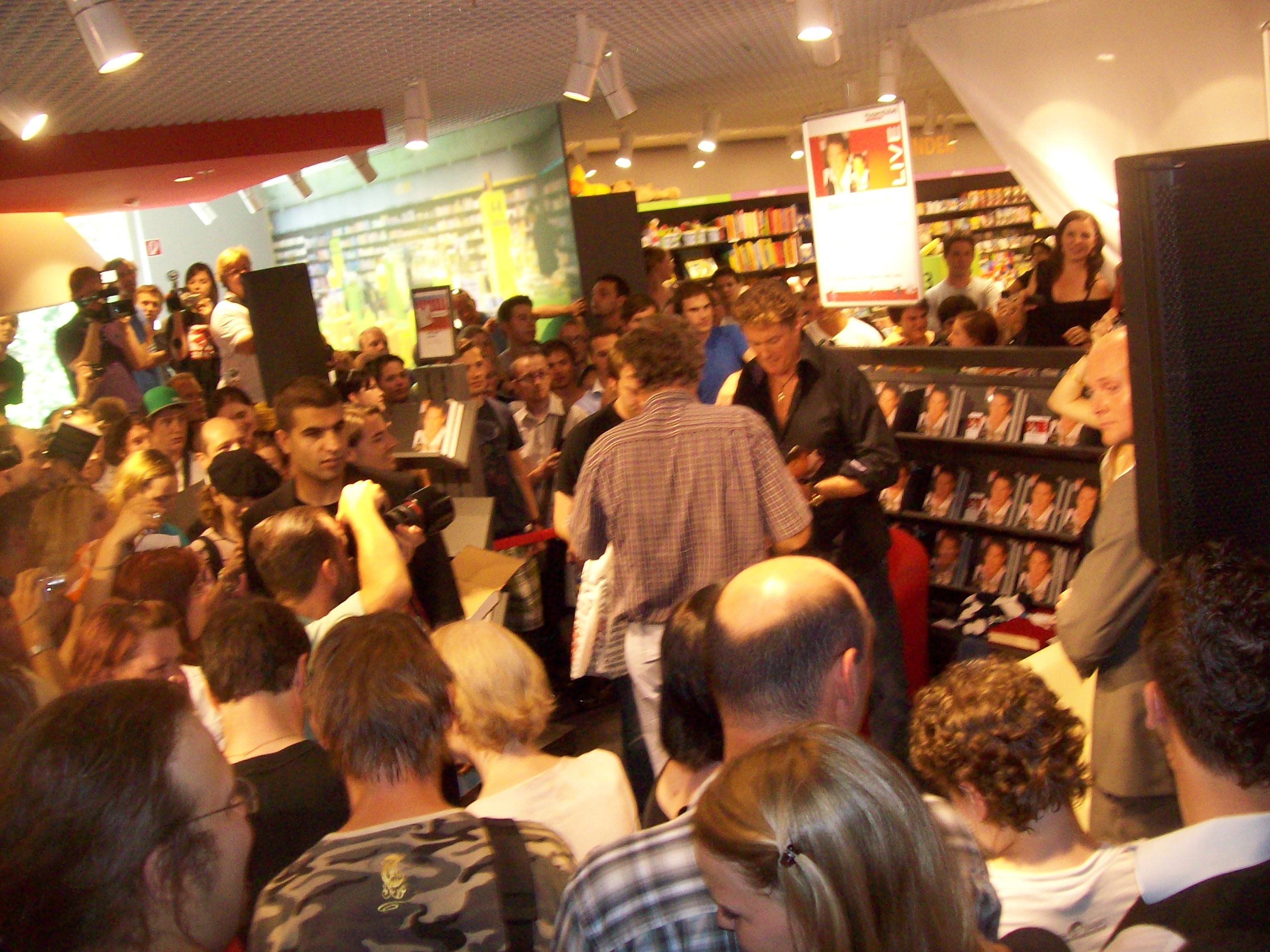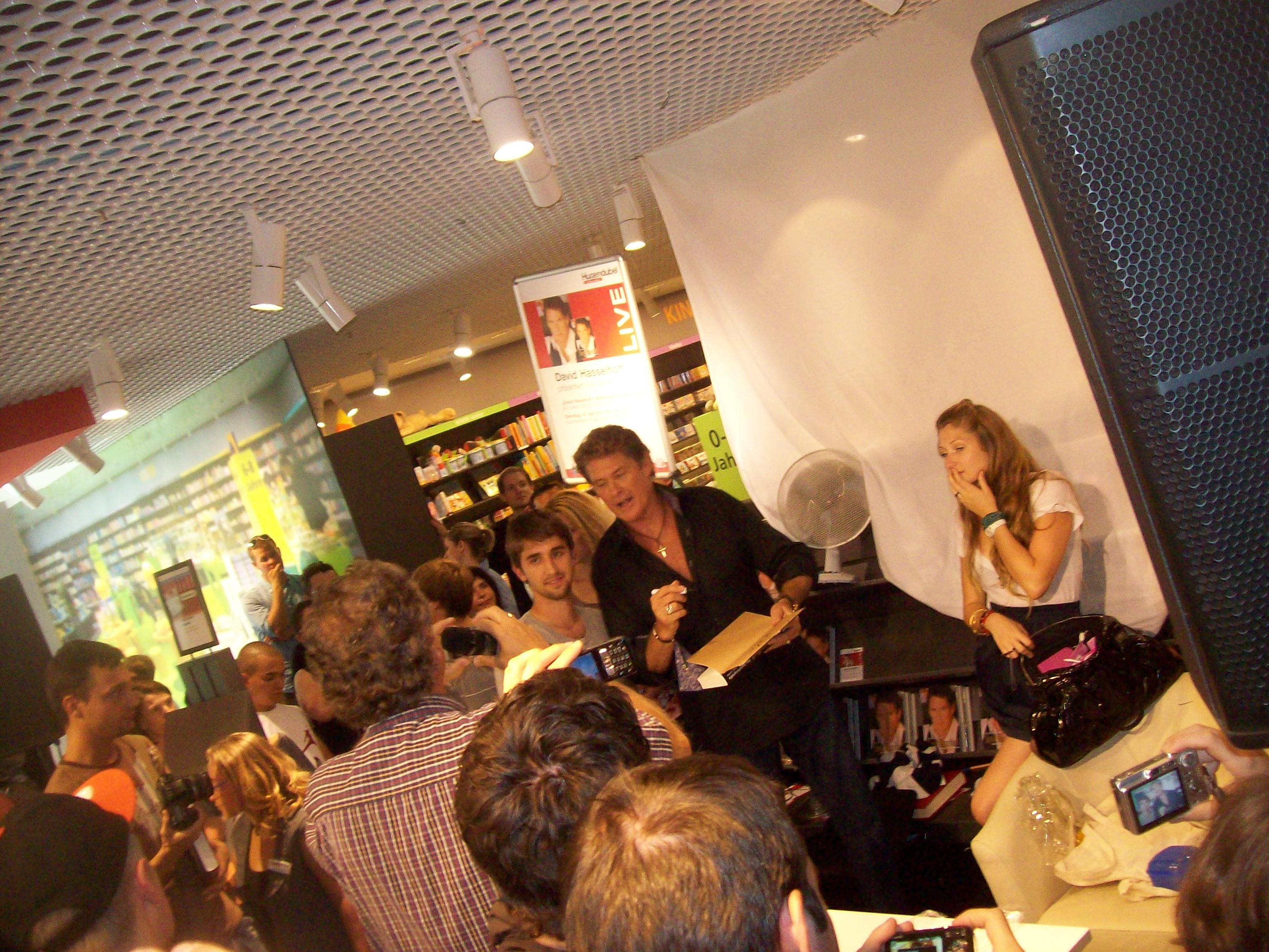 Freundliche Buchladenangestellte verkaufen Exemplare von David Hasselhoffs neuem Buch „Wellengang meines Lebens“. Ich werde beim Kauf gefragt, ob man denn gleich die Schutzfolie entfernen soll, damit Herr Hasselhoff unterschreiben kann. Ich erwidere lachend: „Ja klar!“ Zu diesem Zeitpunkt werde ich von meinen Freunden und Begleitern für den Erwerb des Buches noch ausgelacht. Doch später wird sich herausstellen, dass mir genau dieses Buch ein Foto und ein Autogramm ermöglichen. Ha!!!
