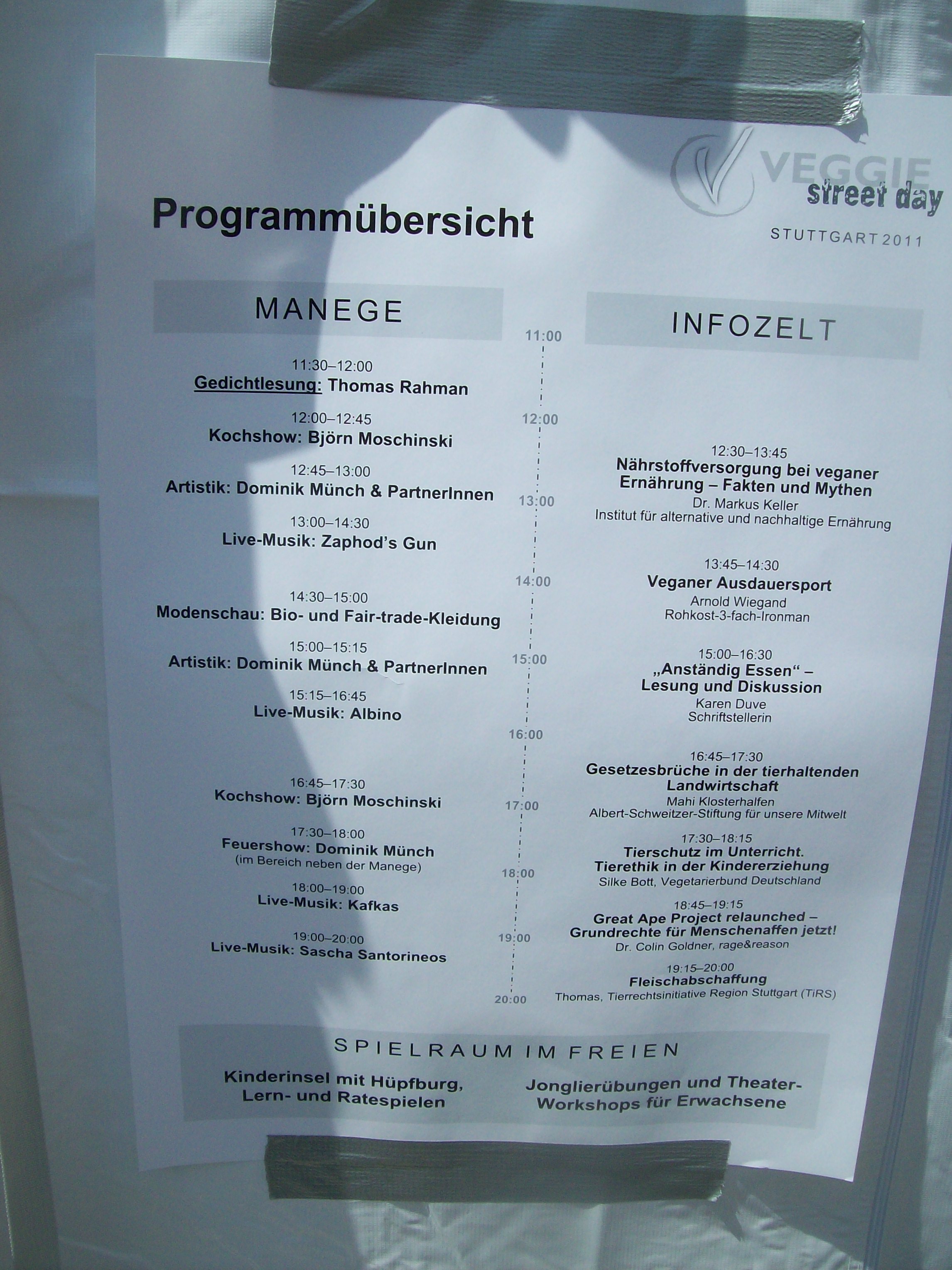 Nach einigen erfolgreichen Straßenfesten in Dortmund ging der Veggie Street Day am gestrigen Pfingstsonntag auch in der Schwabenmetropole in seine zweite Runde. Diesmal noch umfangreicher und bunter als im Vorjahr. Neben zig Essensständen gab es Live-Musik, Workshops, Vorträge, Infostände und eine Modenschau.